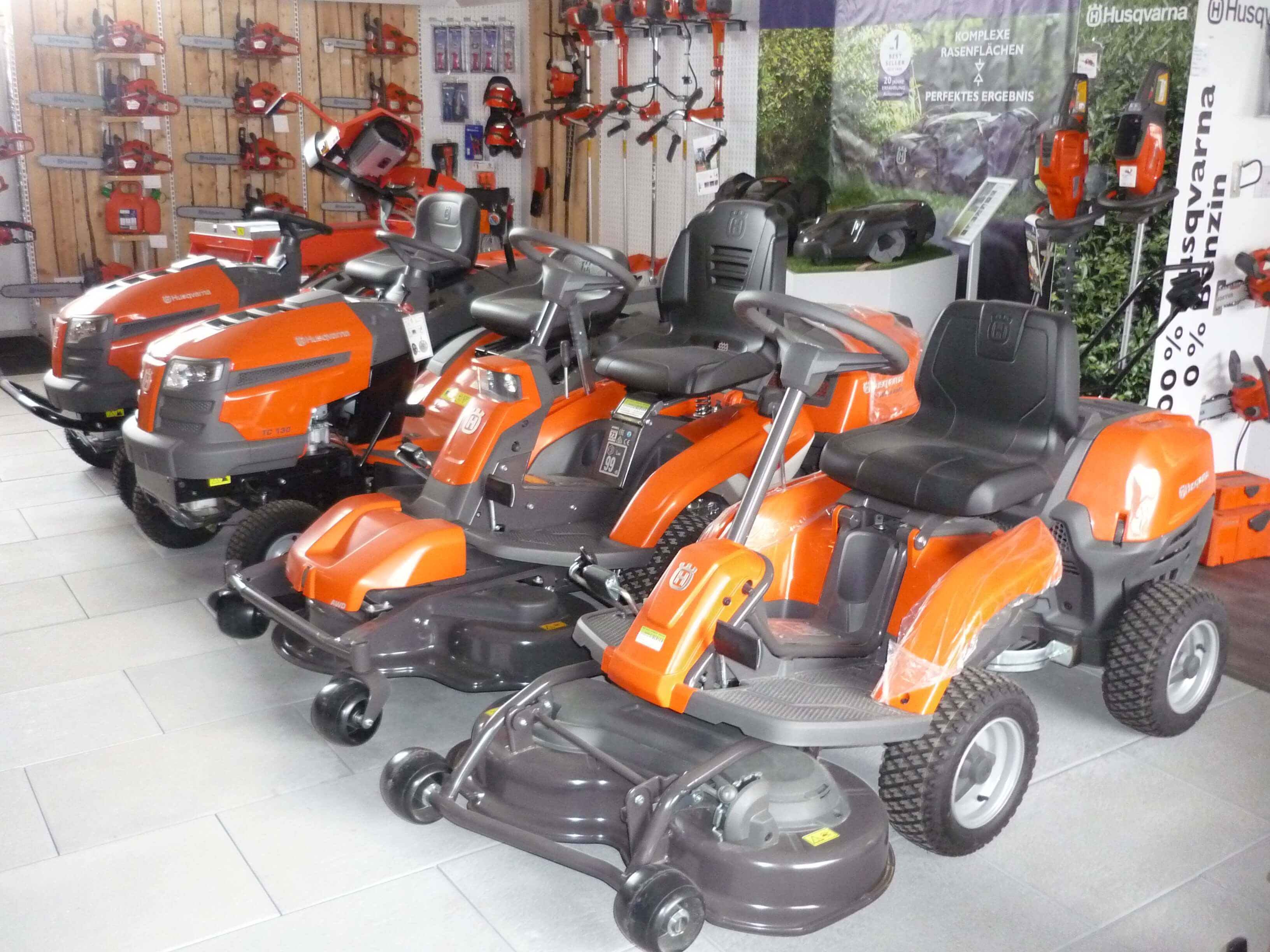 Wir führen Rasenmäher, Rasentraktoren, Aufsitzmäher, Mähroboter Automower, Frontmulcher, Allradtraktoren, Hochgrasmäher, Wiesenmäher, Balkenmäher, Einachser, Gartenhäcksler, Motorhacken, Motorsägen, Motorsensen, Freischneider, Heckenscheren, Blasgeräte, Akku Geräte, Kehrmaschinen, Schneefräsen, Schneeschilder, Hochdruckreiniger, Stromerzeuger, Seilwinden, Kreissägen, Holzspalter u.v.m.